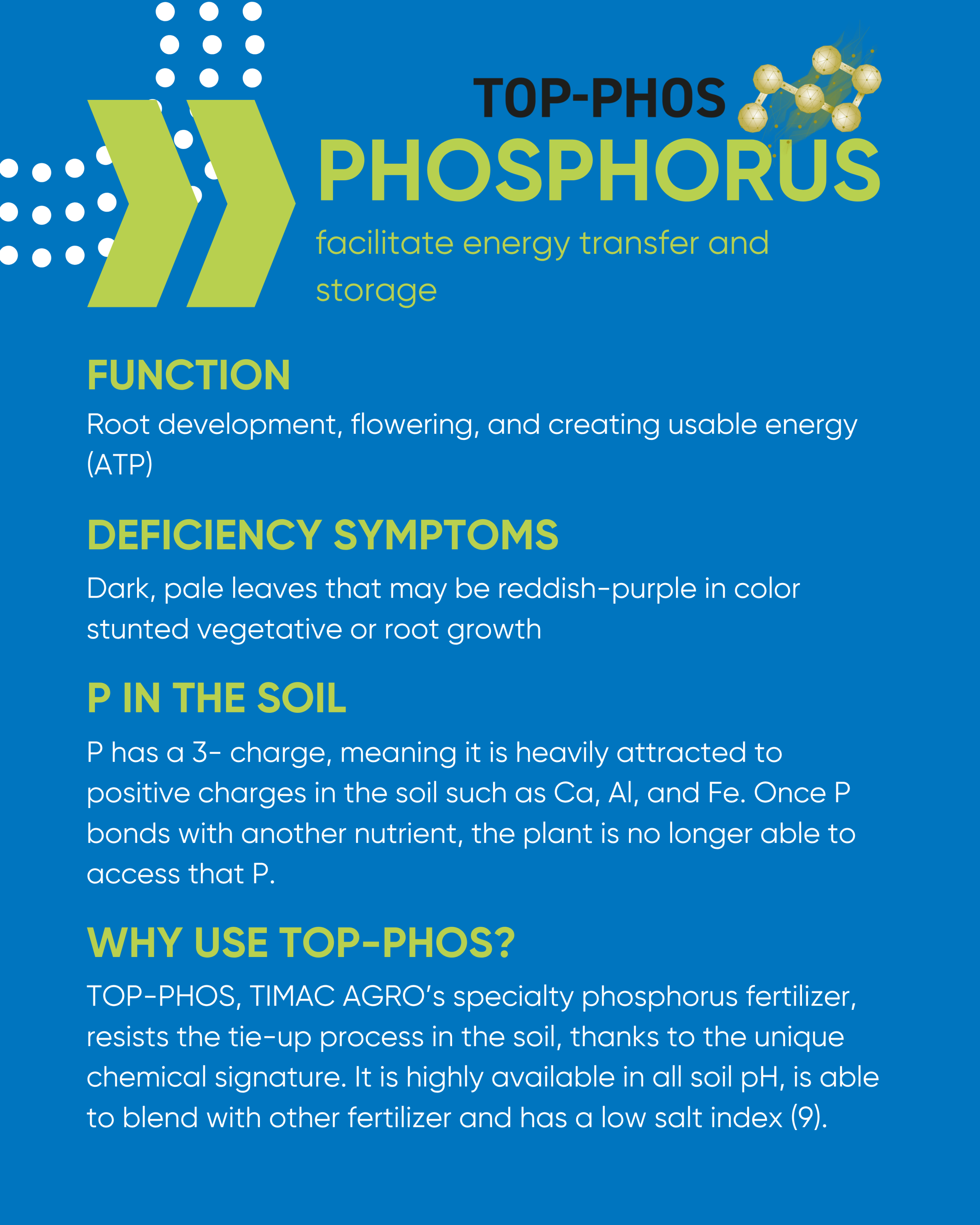 Top-Phos: A Revolutionary Phosphorus Fertilizer. Top-Phos is the result of an innovative, patented manufacturing process that complexes phosphate with humic substances and marine calcium. This protects the phosphate from tie-up in all soil pH conditions, while also stimulating root development and microbial activity in the rhizosphere to support greater nutrient uptake. Importantly, it is available in cool soil conditions, ensuring consistent phosphorus availability throughout the growing season.